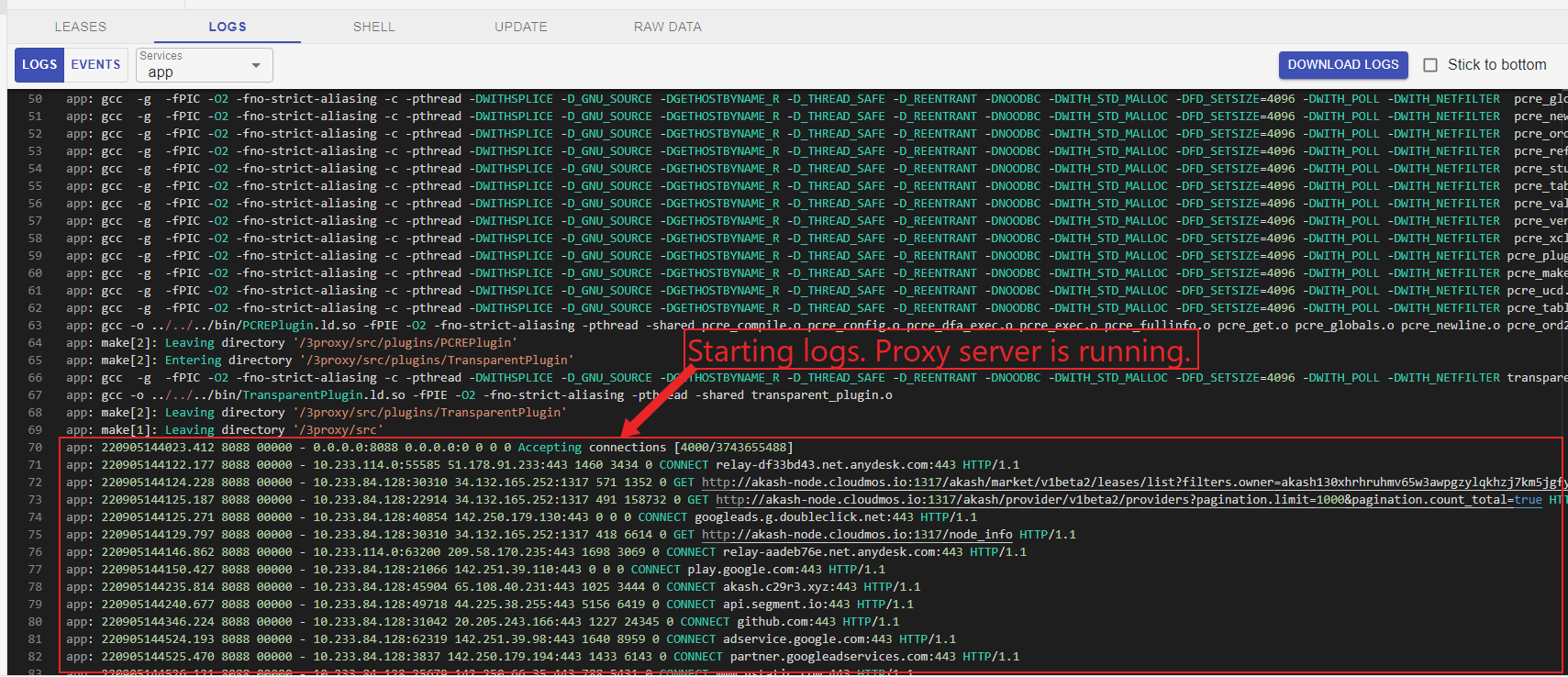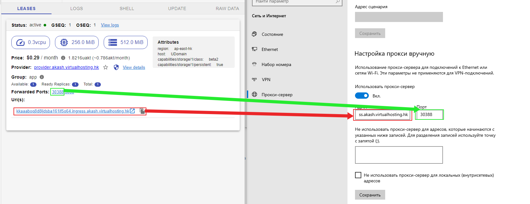 After the deployment is complete, specify the provider.example.com of the server in your browser settings and forwarded port 8088 or 1080 for a socks cnnection.